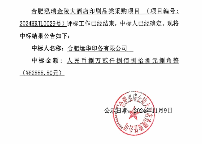 合肥泓瑞金陵大酒店印刷品类采购项目中标结果公告