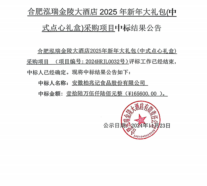 合肥泓瑞金陵大酒店 2025 年新年大礼包(中式点心礼盒)采购项目中标结果公告
