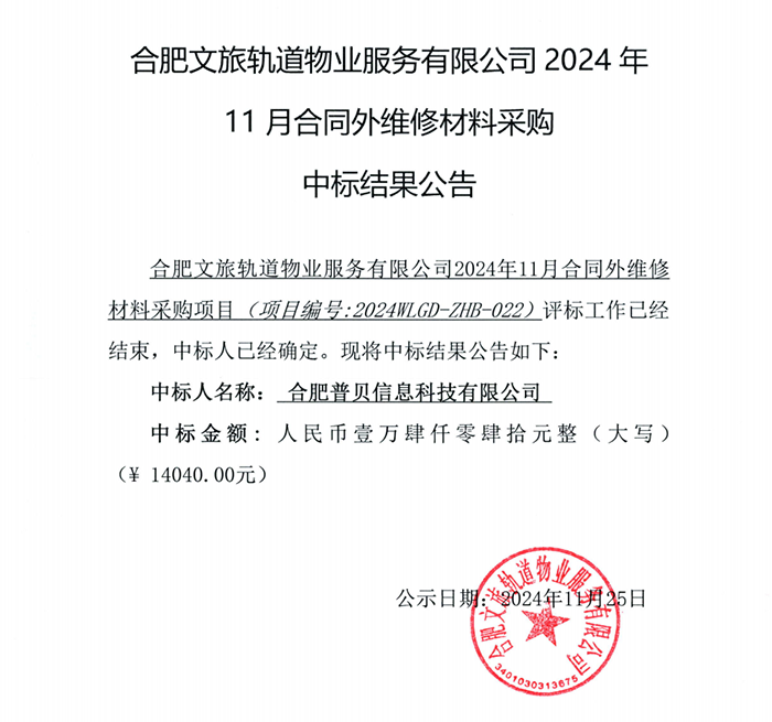 合肥文旅轨道物业服务有限公司 2024 年11 月合同外维修材料采购中标结果公告