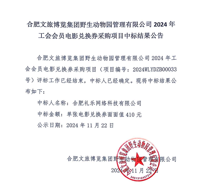 合肥文旅博览集团野生动物园管理有限公司2024年工会会员电影兑换券采购项目中标结果公告
