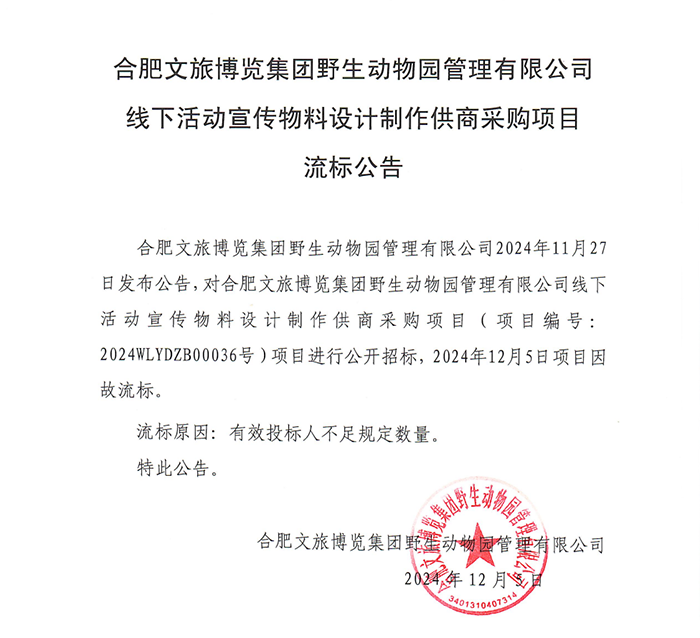 合肥文旅博览集团野生动物园管理有限公司线下活动宣传物料设计制作供商采购项目流标公告