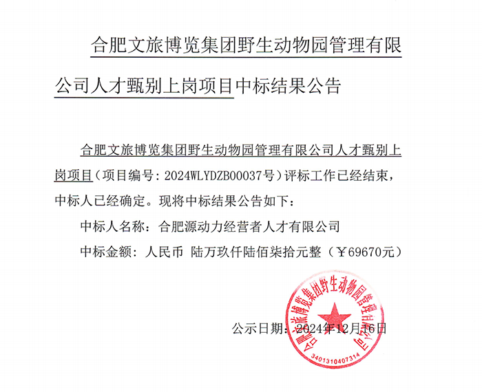 合肥文旅博览集团野生动物园管理有限公司人才甄别上岗项目中标结果公告