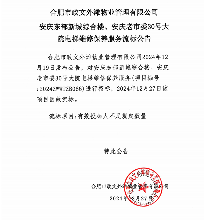 合肥市政文外滩物业管理有限公司安庆东部新城综合楼、安庆老市委30号大院电梯维修保养服务流标公告