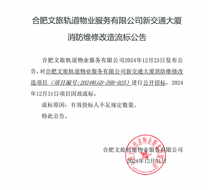 合肥文旅轨道物业服务有限公司新交通大厦消防维修改造流标公告