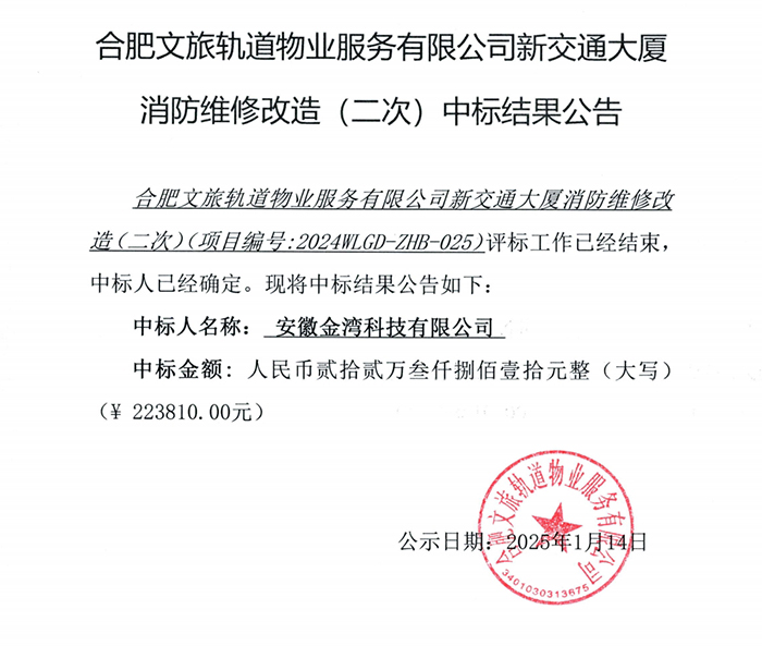 合肥文旅轨道物业服务有限公司新交通大厦消防维修改造(二次)中标结果公告