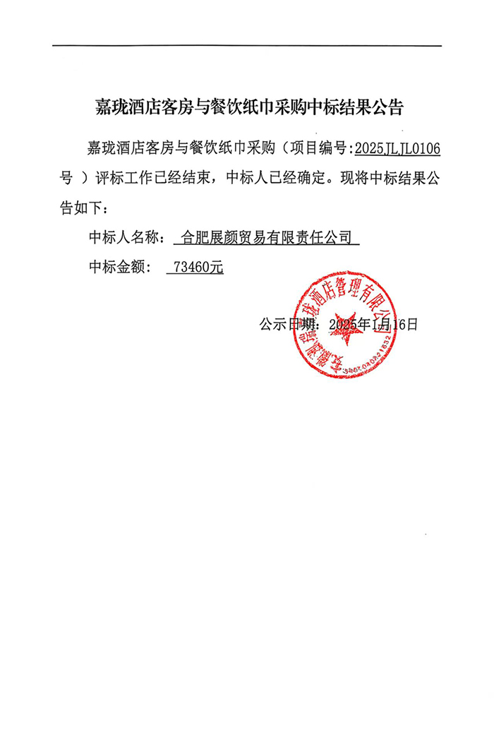 嘉珑酒店客房与餐饮纸巾采购中标结果公告