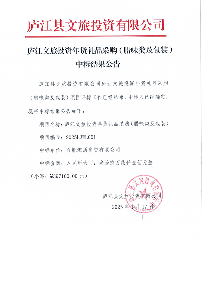 庐江文旅投资年货礼品采购(腊味类及包装)中标结果公告