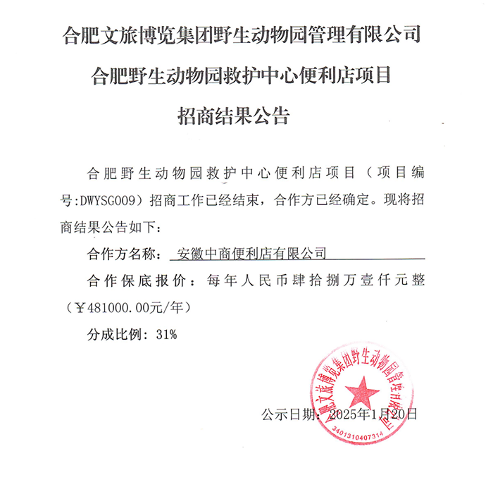 合肥文旅博览集团野生动物园管理有限公司合肥野生动物园救护中心便利店项目招商结果公告