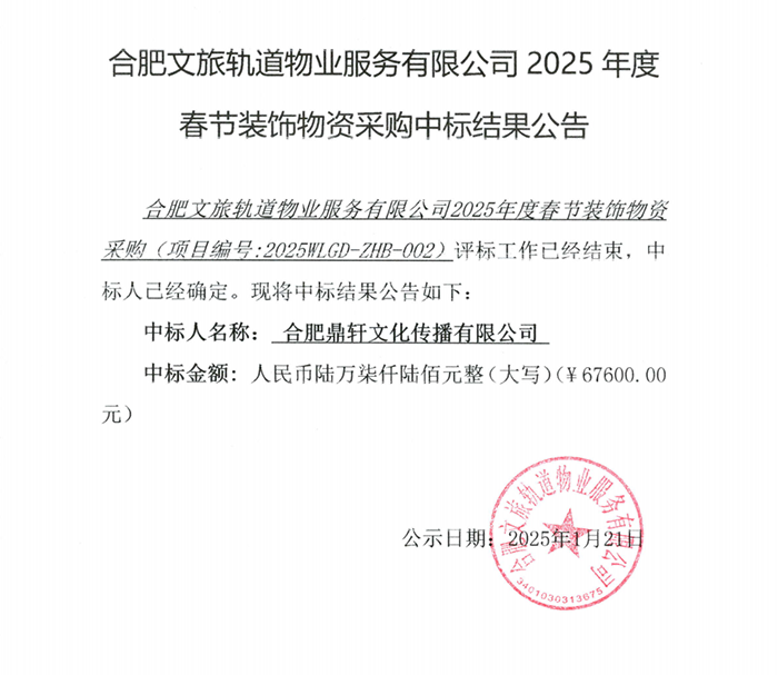 合肥文旅轨道物业服务有限公司 2025 年度春节装饰物资采购中标结果公告