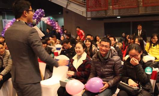 下午14:00,活动正式开始,全体互动游戏击鼓传花把场内气氛推向一个小高潮。一共3轮的击鼓传花不仅带动了现场气氛,也让数位嘉宾上台进行了自我介绍,表演了才艺,引来阵阵掌声和欢笑。经过数轮热身活动后,开始主题活动“五觉体验”。10对男女嘉宾上台,经过“嗅觉”选取心仪对象,通过“触觉”一起走过障碍物,再由“味觉”互喂糖果,“视觉”画出彼此心目中的男神女神,最后由“听觉”去深入了解。让一对对俊男靓女从陌生走向熟悉,活动中穿插的互动游戏“踩气球”与“五觉体验”一起把活动推向了最高潮。在“视觉”过程中,主持人挑选12对嘉宾上台进行对战,两人一组并在腿上绑上气球,场面热烈,笑声掌声不断。16:30,活动在抱抱团的全场互动及幸运大抽奖的现场表白中圆满结束。